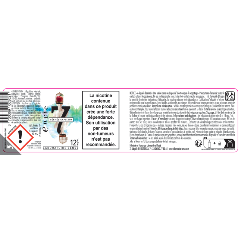 Pour les e-liquides nicotinés, un avertissement sanitaire, un pictogramme réglementaire, des conseils de prudence et une vignette tactile pour les personnes malvoyantes sont ajoutés.