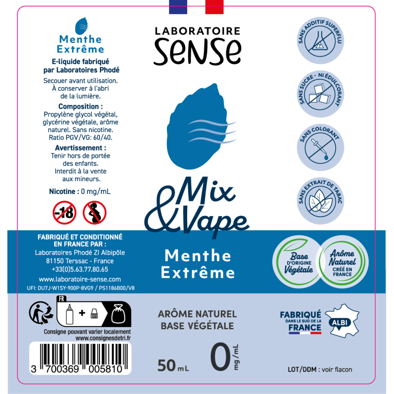 Le Laboratoire Sense sort une version Mix & Vape 60 ml de ses e-liquides vedettes. Le e-liquide Menthe Extrême Mix & Vape en 60 ml est disponible en deux taux de nicotine. Selon le taux choisi, le pack Mix & Vape contient :