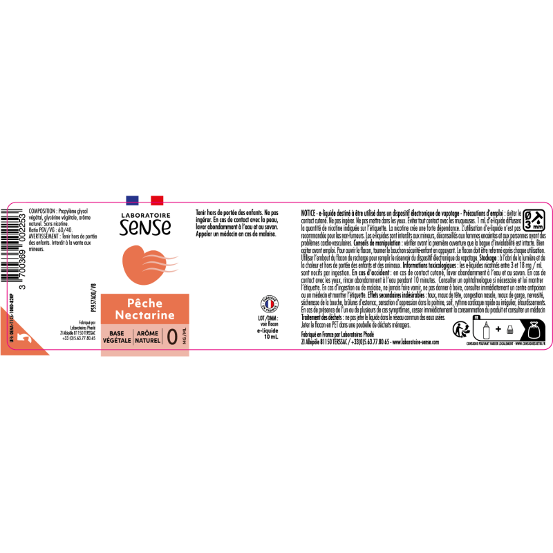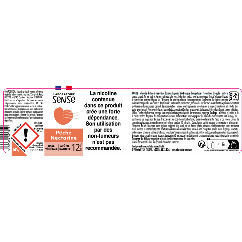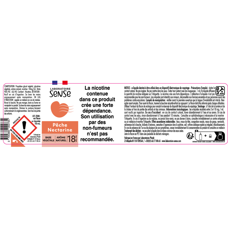 Au dos de chaque étiquette, se trouve une notice d'information à usage des consommateurs. L'Etiquetage est conforme au règlement CLP 1272/2008/CE relatif à la classification et à l’étiquetage des mélanges. Il est également conforme à la Directive européenne 2014/40/UE.