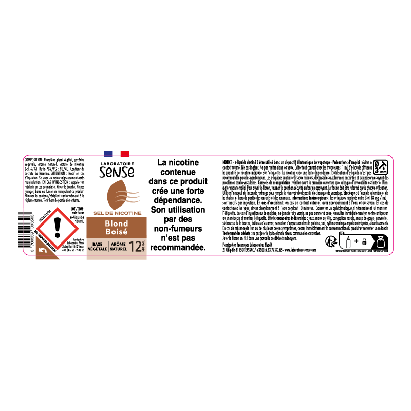 Attention : respecter les précautions d'emploi. 12 mg/mL en sel de nicotine : H302. Nocif en cas d'ingestion