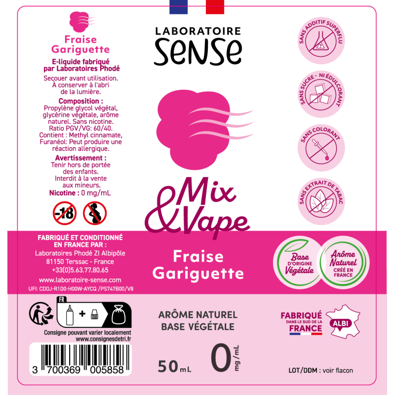 Le Laboratoire Sense sort une version Mix & Vape 60 ml de ses e-liquides vedettes. Le e-liquide Fraise Gariguette Mix & Vape en 60 ml est disponible en deux taux de nicotine. Selon le taux choisi, le pack Mix & Vape contient :