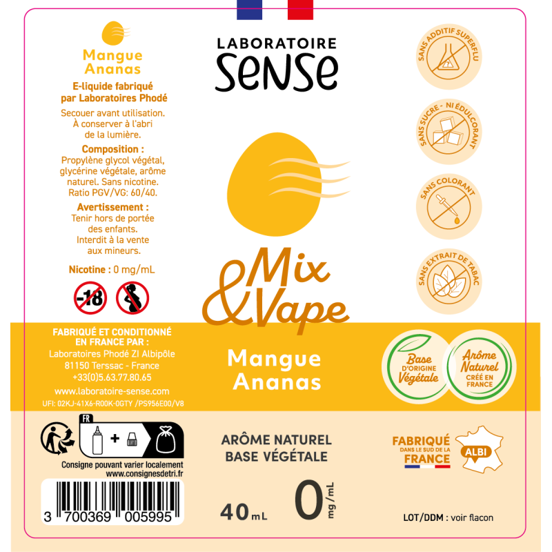Le Laboratoire Sense sort une version Mix & Vape 60 ml de ses e-liquides vedettes. Le e-liquide Mangue Ananas Mix & Vape en 60 ml est disponible en deux taux de nicotine. Selon le taux choisi, le pack Mix & Vape contient :