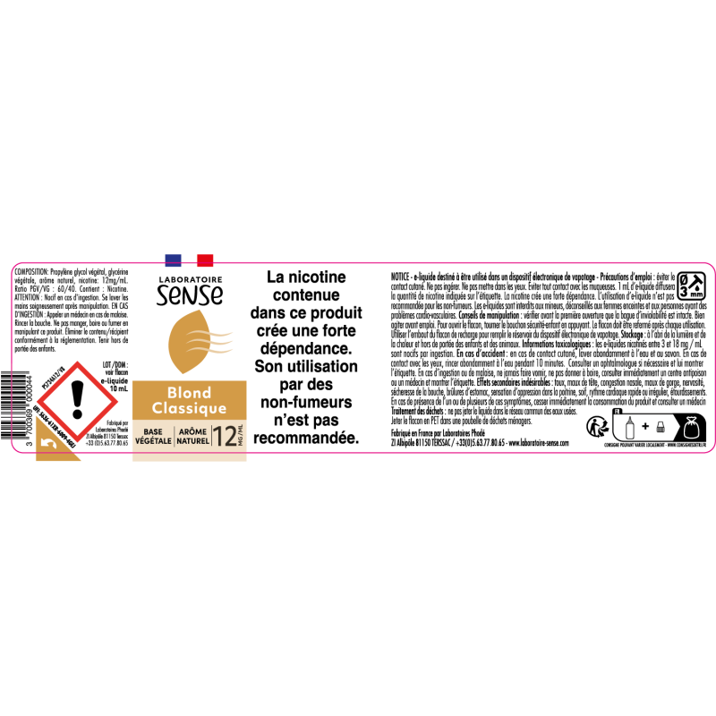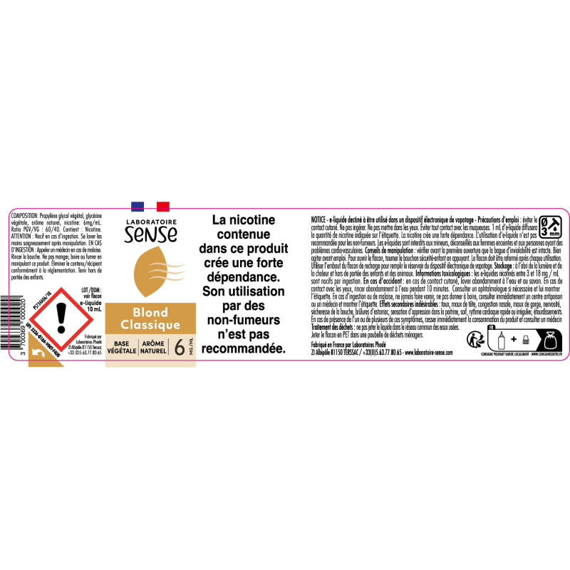 Au dos de chaque étiquette, se trouve une notice d'information à usage des consommateurs. L'Etiquetage est conforme au règlement CLP 1272/2008/CE relatif à la classification et à l’étiquetage des mélanges. Il est également conforme à la Directive européenne 2014/40/UE.