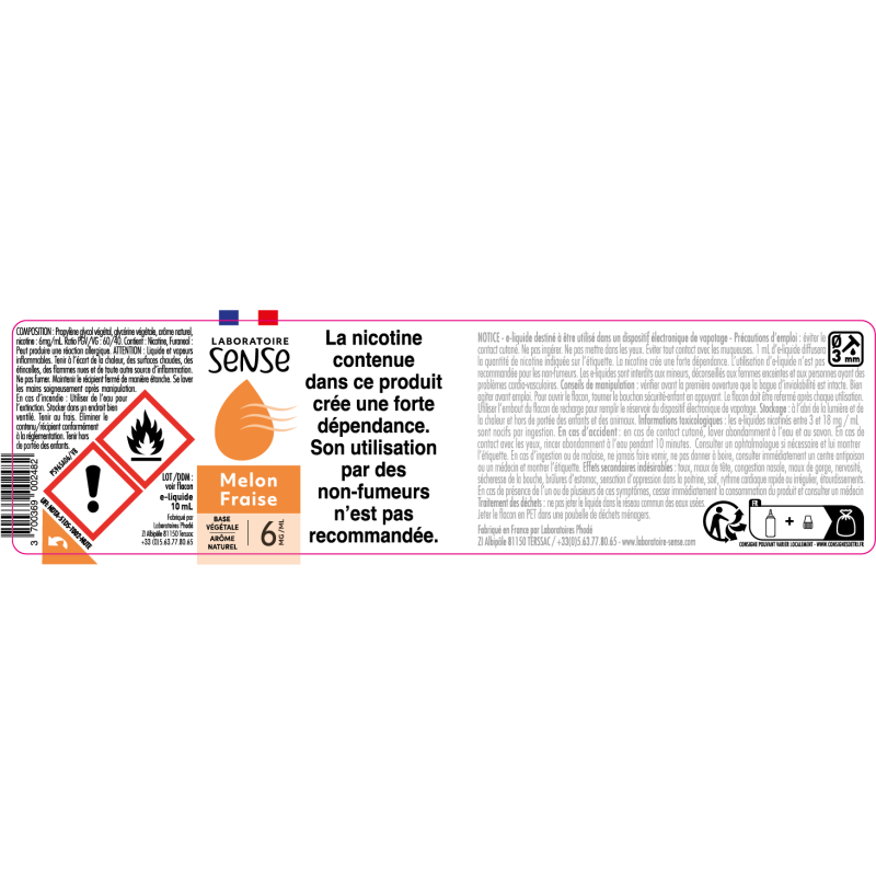Conformément à la législation européenne, chaque flacon présente un étiquetage avec la dénomination commerciale, la marque, le parfum, la composition du e-liquide, le taux de nicotine, le nom, l’adresse de la société, la date limite d'utilisation optimale et le numéro de lot.