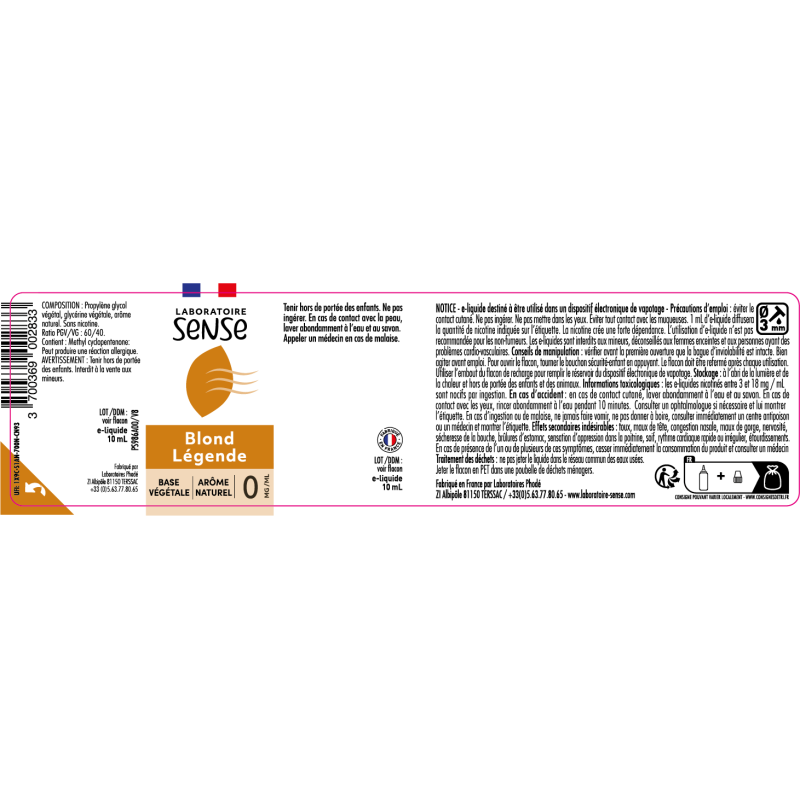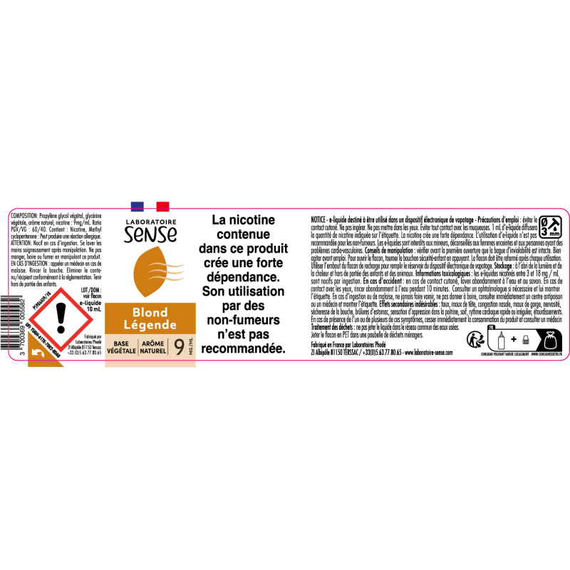 Au dos de chaque étiquette, se trouve une notice d'information à usage des consommateurs. L'Etiquetage est conforme au règlement CLP 1272/2008/CE relatif à la classification et à l’étiquetage des mélanges. Il est également conforme à la Directive européenne 2014/40/UE.